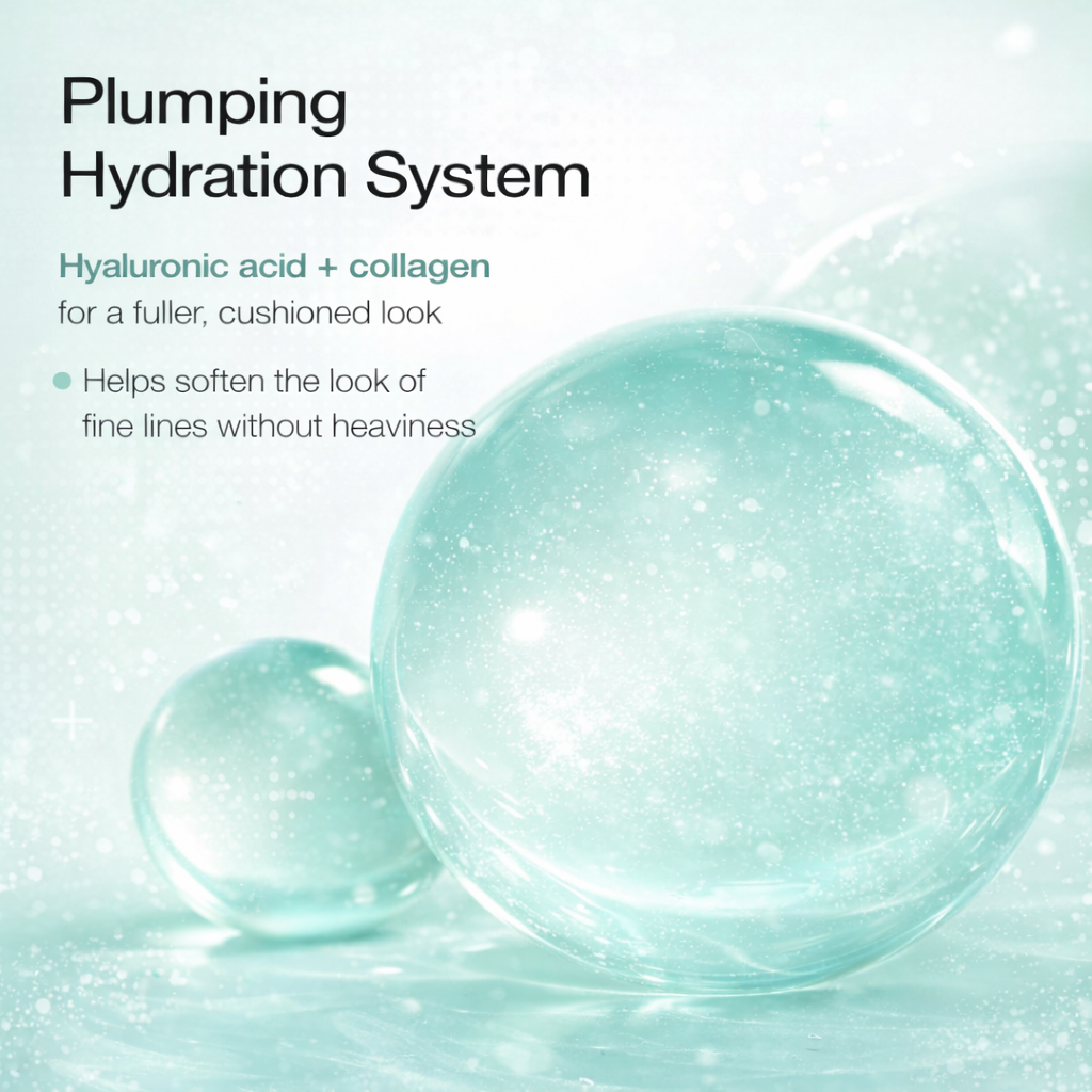 Hyaluronic acid attracts and locks in moisture while collagen helps create a visibly fuller, cushioned look. This dual-action system gives skin a plumped, “filled” appearance, helping lines look softer and restoring youthful bounce without heaviness.